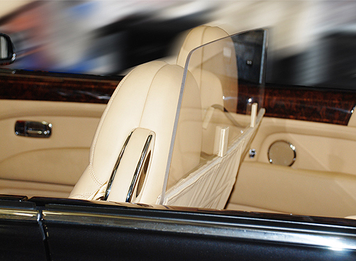 Windschotts für Cabrios sind meist zweiteilig und bestehen aus dem senkrecht stehenden Windschott sowie einem verbundenen netzbespannten Rahmen, einer Platte oder einer Plane. Dieses untere Teil verhindert, dass die vom Windschott nach unten abgeleiteten Luftwirbel zwischen oder neben den Sitzen nach vorn strömen. Windschott AutoBild Test